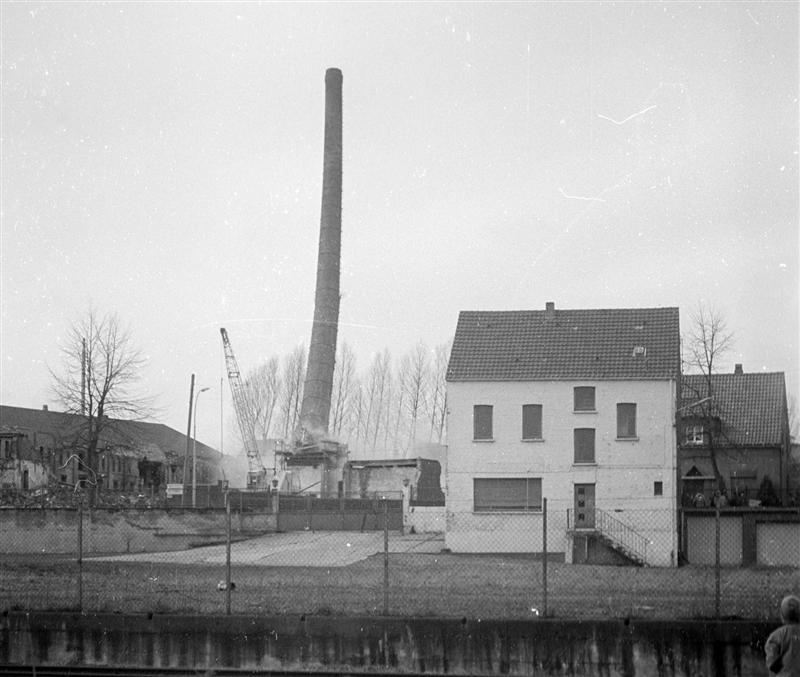 Brüggen war früher von Tonindustrie (Herstellung von Dachziegeln und Tonröhren) geprägt. Der Schornstein dieser Ziegelei wird gerade gesprengt.