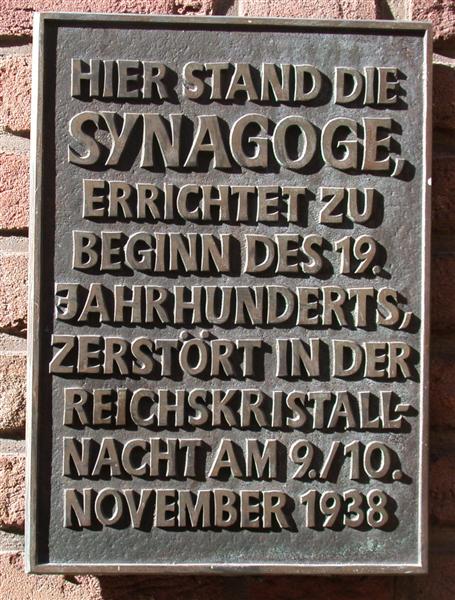 Tafel zur Erinnerung an die in der Pogromnacht zerstörte Synagoge, die in der rechten Häuserreihe auf dem vorangehenden Foto stand